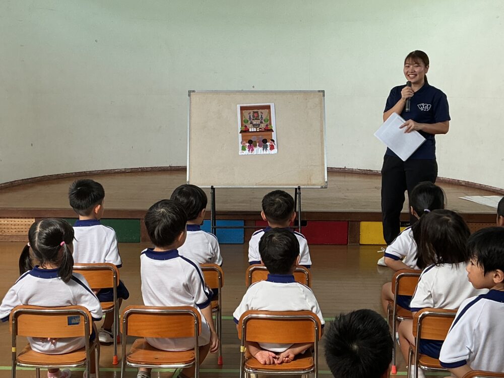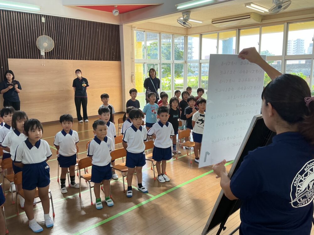みんなでお盆についてお話しを聞きました。 ウンケー・ナカビ・ウークイ という言葉を覚えましたよ! お盆の日にご先祖様にたいして「感謝」の気持ちをもってお迎えしようねと、 みんなでウートートー☺️ ⚽ジンベーニョ君が遊びに来てくれました⚽ 🐬秋の遠足~🐬 関連記事一覧 🎅お楽しみ会🎄 平和についての学び(西原の塔見学) 春の遠足 交通安全指導を受けました♪